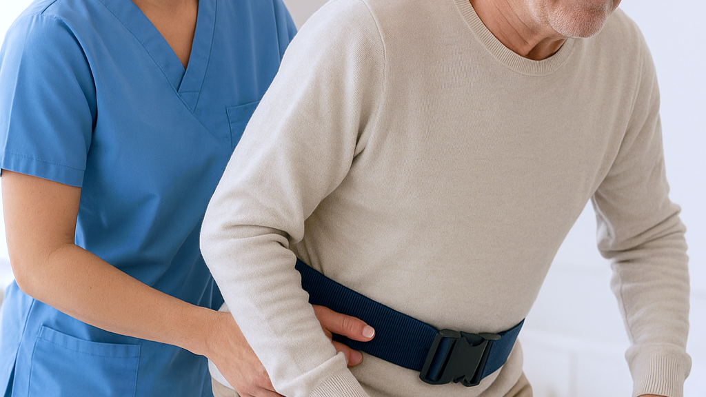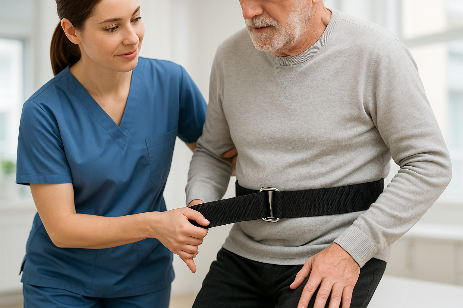 A gait belt is safety device utilized by healthcare professional, including caregivers, nurses, and physical therapists, to support individuals with mobility impairments during ambulation, standing, or transfers between positions.